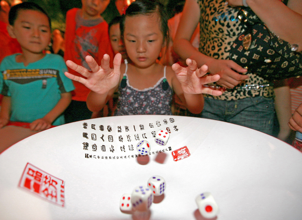 博餅(擲骰子得月餅游戲,是一種將六個(gè)骰子扔進(jìn)碗里,不同數(shù)字組合得到不同分?jǐn)?shù)和獎(jiǎng)品的游戲)是廈門中秋節(jié)特有的節(jié)日活動(dòng)。Bobing (Mooncake Dice Game, a game in which six dice are thrown into a bowl and the different combinations of numbers result in different scores and prizes) is a unique festive activity in Xiamen during the Mid-Autumn Festival.