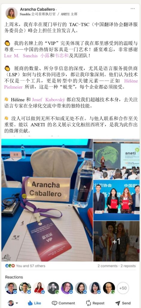 會(huì)議期間,我代表 ANETI 與中國翻譯協(xié)會(huì)翻譯服務(wù)委員會(huì)簽署了合作協(xié)議,ANETI 成為了第一個(gè)建立合作關(guān)系的外國協(xié)會(huì)。中國國內(nèi)市場在多年增長后放緩,語言服務(wù)商正在尋找新的合作伙伴關(guān)系,希望深入了解西方市場的動(dòng)態(tài)?,F(xiàn)在,至少有 65 家西班牙公司隨時(shí)準(zhǔn)備好與他們開展合作。除此之外,Arancha Caballero還在社交平臺(tái)上分享了此次參會(huì)的感受。