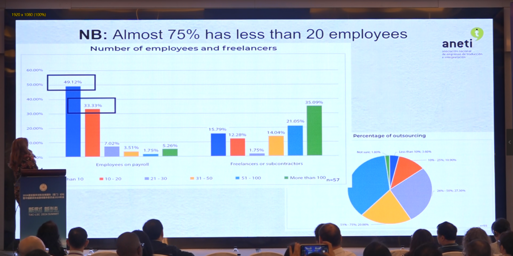 我解釋說,我們的研究是為了填補(bǔ)西班牙最新數(shù)據(jù)的空白。演講中展示了西班牙翻譯公司的概況,即通常情況下,員工少于 20 名,營業(yè)額不足 50 萬歐元,且全球 100 強(qiáng)中只有一家西班牙翻譯企業(yè)上榜。
