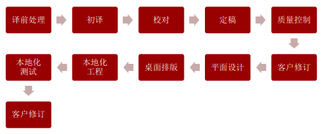 - 縝密的項(xiàng)目流程。由于該項(xiàng)目的文件類型眾多,涉及多道工序,多個(gè)生產(chǎn)部門,因而一個(gè)嚴(yán)謹(jǐn)合理的項(xiàng)目流程規(guī)劃是至關(guān)重要的。接收到 Polygon Company 網(wǎng)站全站源文件后,項(xiàng)目經(jīng)理首先對(duì)文件進(jìn)行了分類,并將有問題的文件反饋給客戶重新發(fā)送,直至所有文件都確認(rèn)無誤。 隨后,項(xiàng)目經(jīng)理將文件發(fā)送給工程師,進(jìn)行必要的譯前處理,分析出各個(gè)工序的工作量信息,并將包括工序流程,工作量,項(xiàng)目預(yù)計(jì)周期等信息在內(nèi)的分析報(bào)告發(fā)送給客戶確認(rèn)。一經(jīng)確認(rèn)后,項(xiàng)目經(jīng)理正式啟動(dòng)項(xiàng)目,包括項(xiàng)目管理部、譯審部、技術(shù)部和語料部的生產(chǎn)人員開始根據(jù)項(xiàng)目流程規(guī)劃有條不紊地執(zhí)行項(xiàng)目。具體的項(xiàng)目工序包括:初譯、校對(duì)、定稿、排版、設(shè)計(jì)、本地化工程和測(cè)試等。具體項(xiàng)目流程如下圖所示: